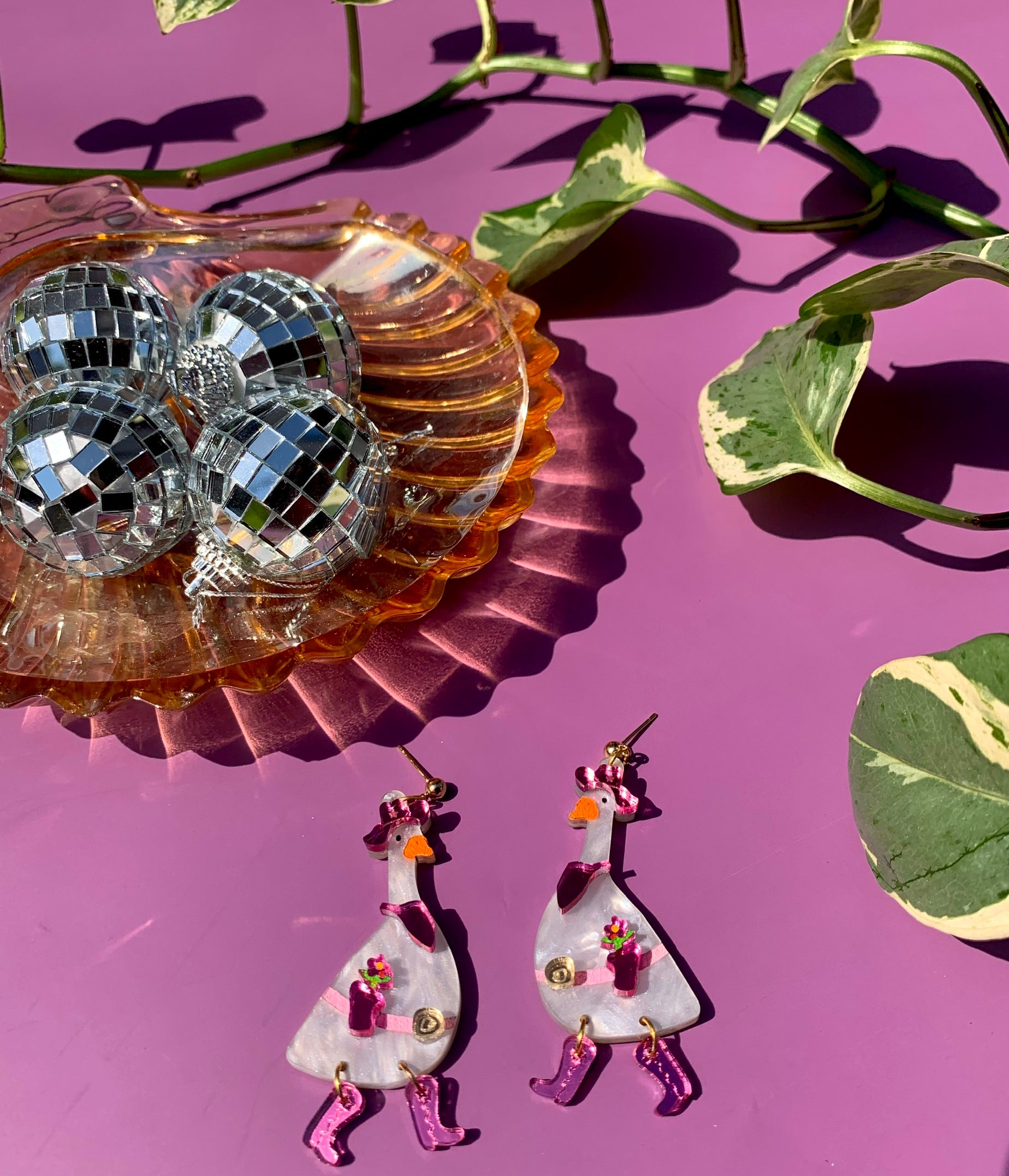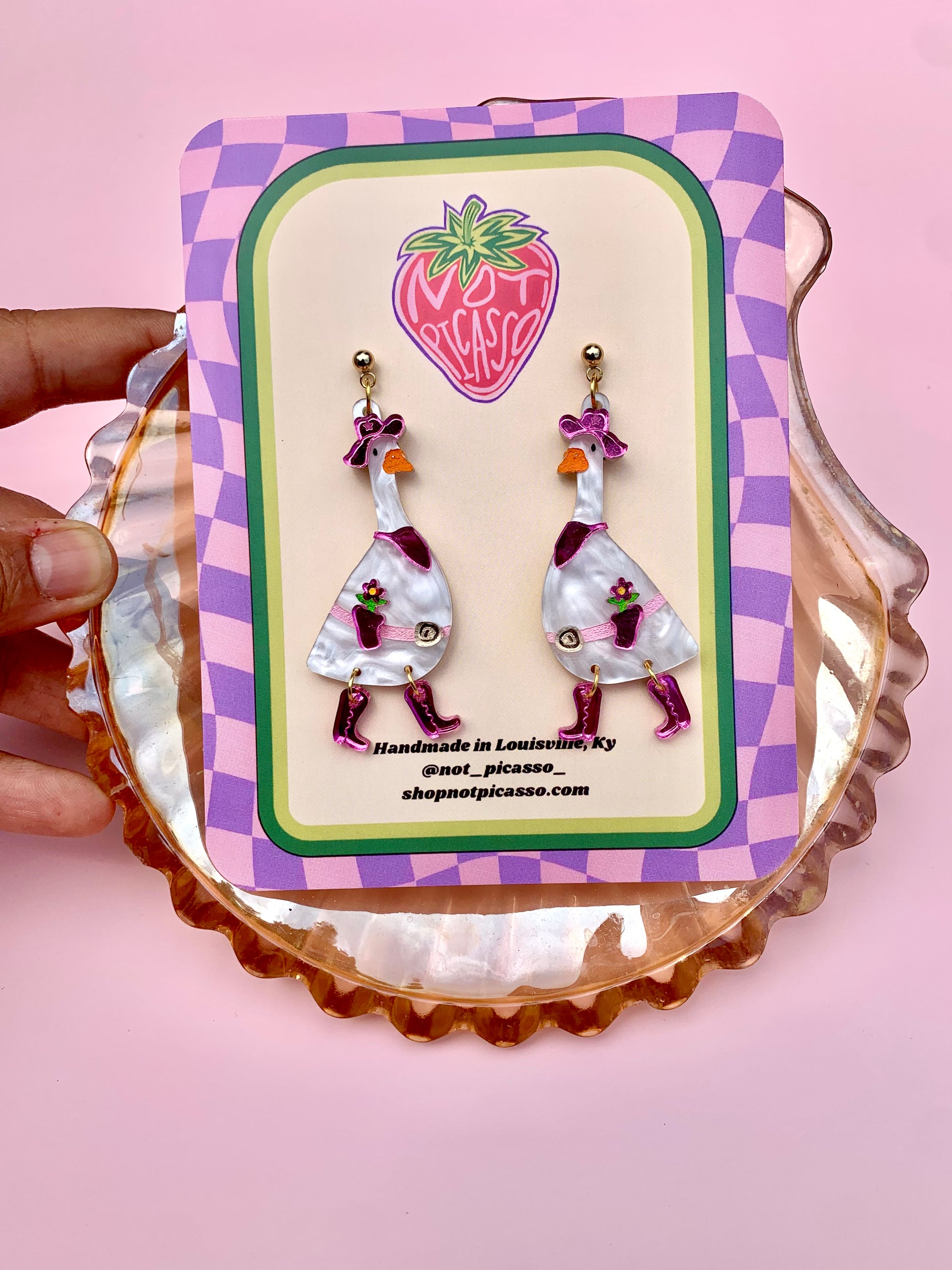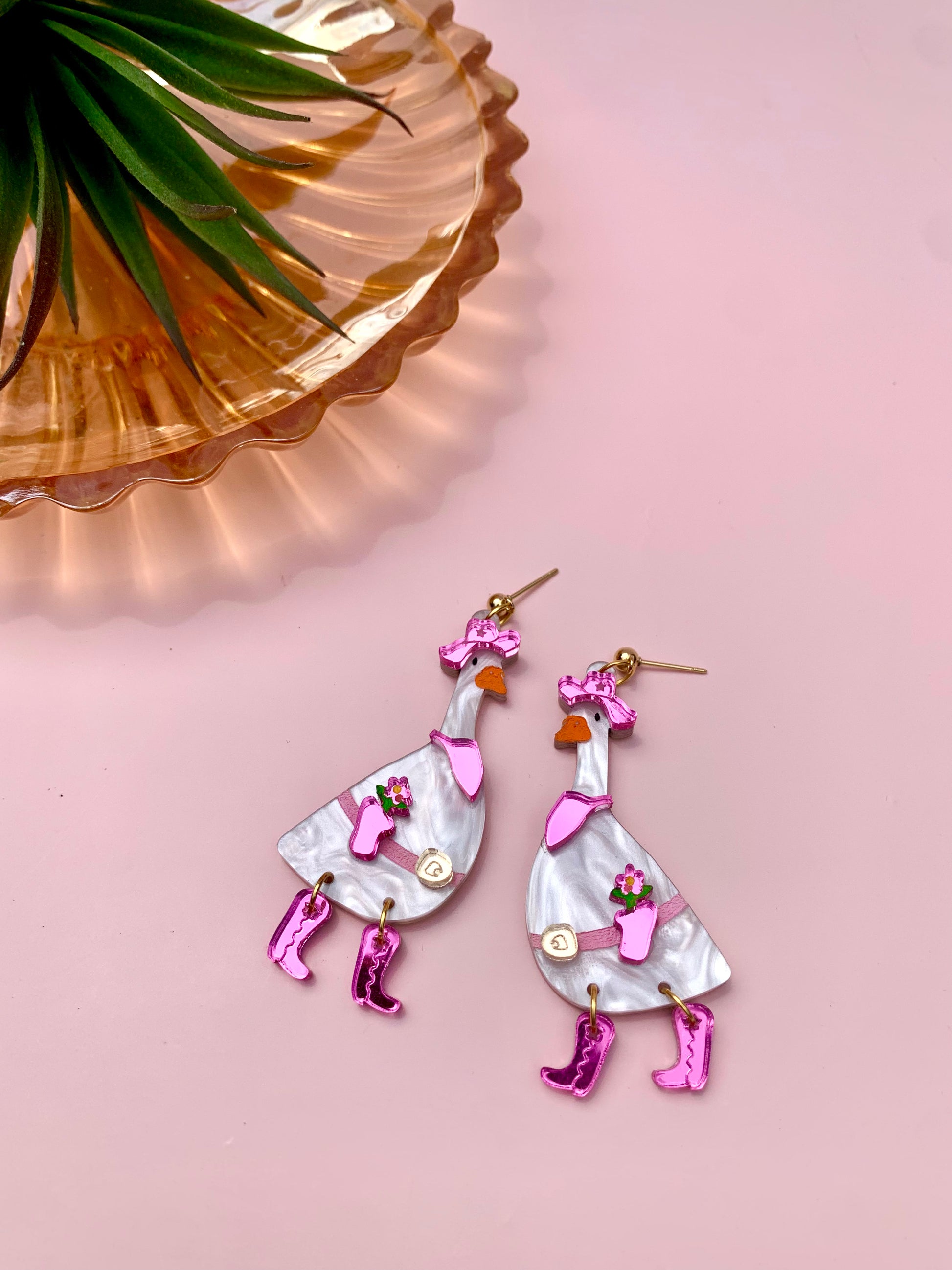 There’s another new goose in town and this time she’s working 9-5! Introducing Dolly Goose. She’s Gertie Goose’s spicy twin sister. She features flashy pink accessories made from mirrored acrylic including her pink cowgirl hat and matching pink flower holster. Her boots were definitely made for walking as they are able to move and shake. She is finished with a stainless steel, nickel-free, post- which is safe for most sensitive ears. . 2.75 x 1 in.
