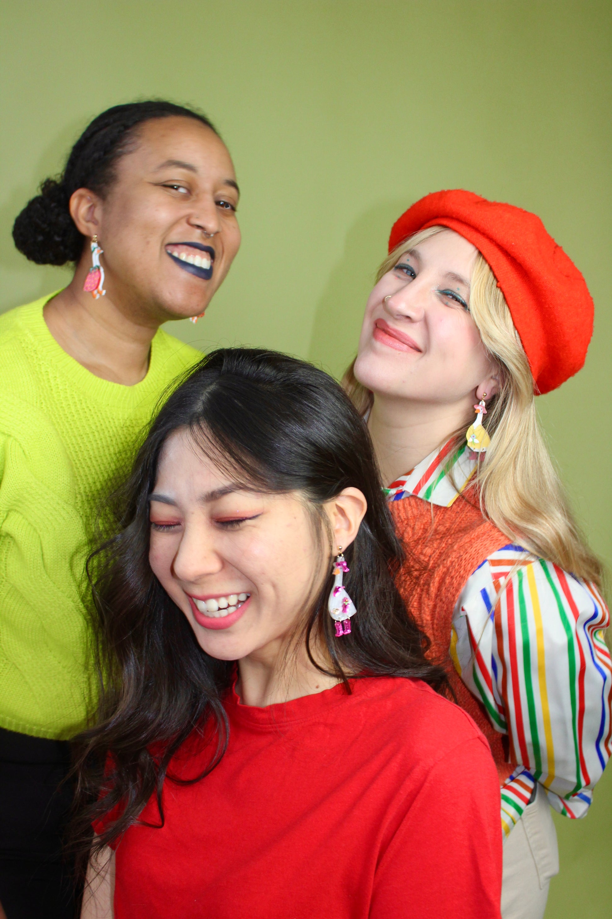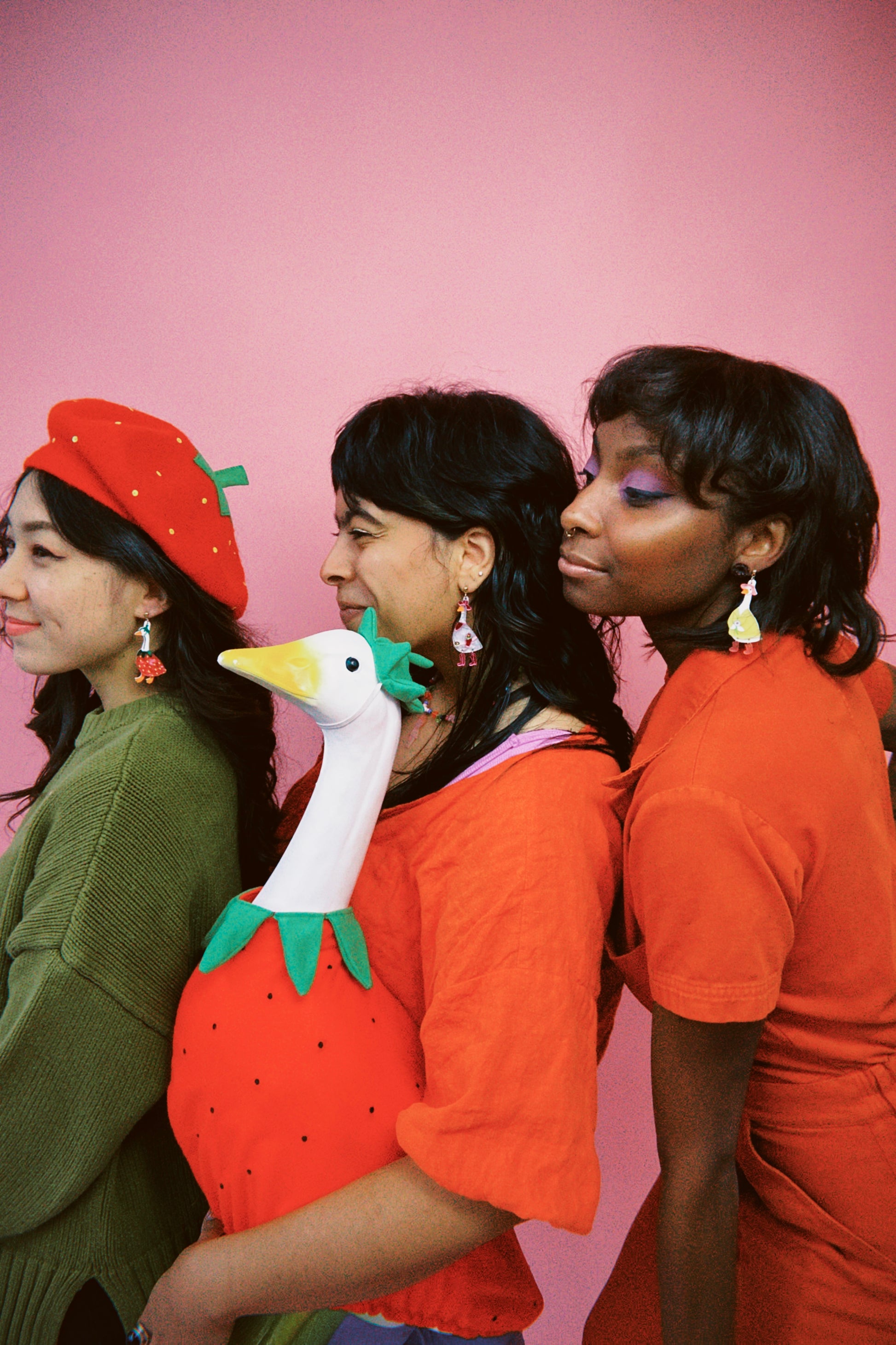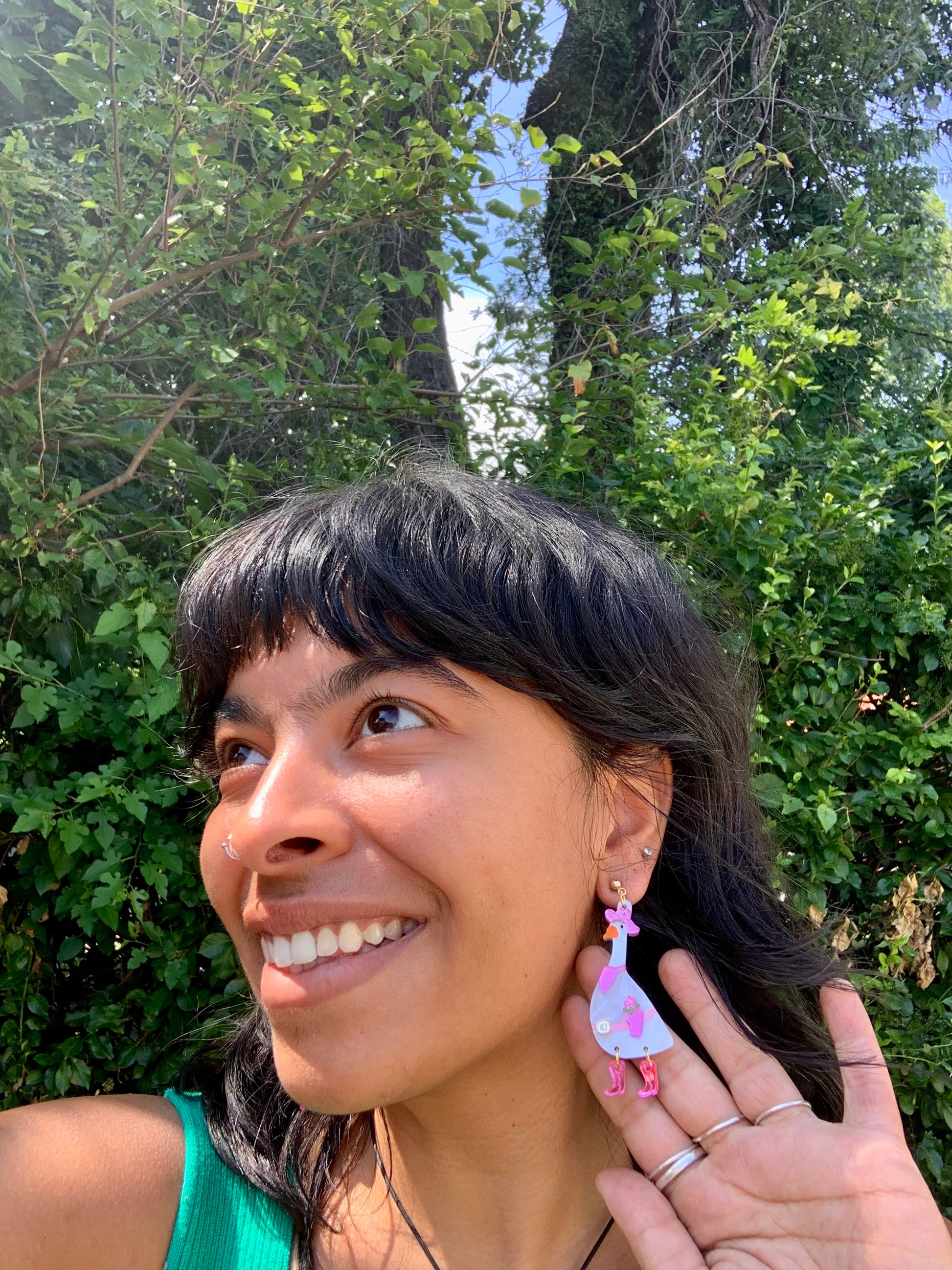 There’s another new goose in town and this time she’s working 9-5! Introducing Dolly Goose. She’s Gertie Goose’s spicy twin sister. She features flashy pink accessories made from mirrored acrylic including her pink cowgirl hat and matching pink flower holster. Her boots were definitely made for walking as they are able to move and shake. She is finished with a stainless steel, nickel-free, post- which is safe for most sensitive ears. . 2.75 x 1 in.