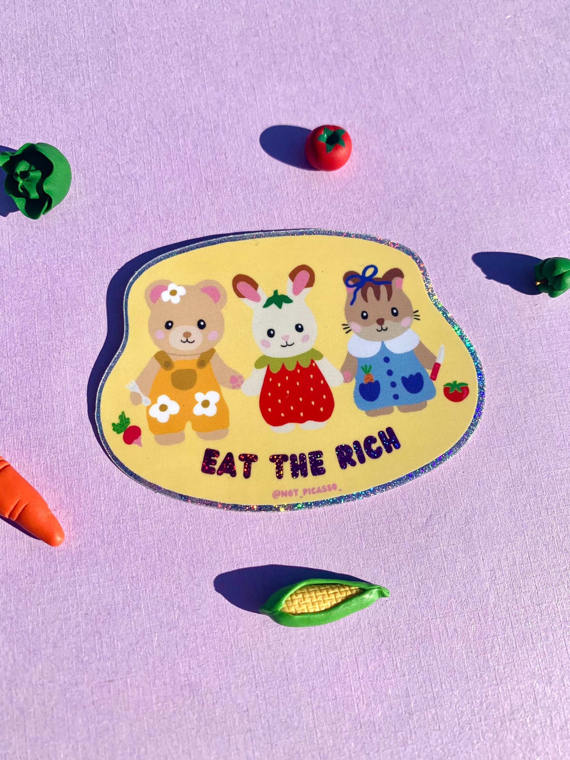 Feeling hungry? This glitter sticker features a great message and cute characters! Measuring at 3 x 2.2 this vinyl sticker is waterproof and weatherproof making it great for phone cases, water bottles, laptops, and more!