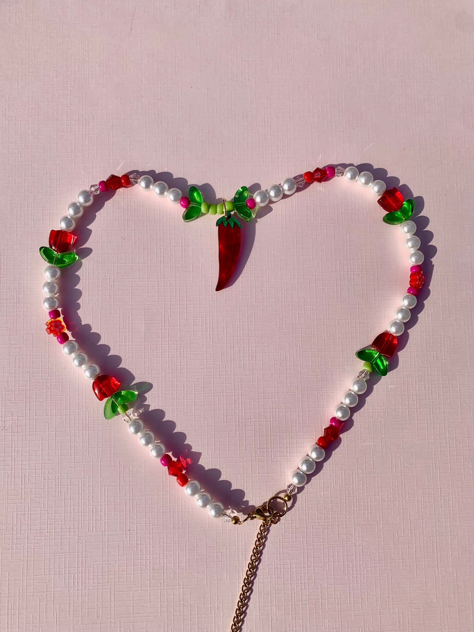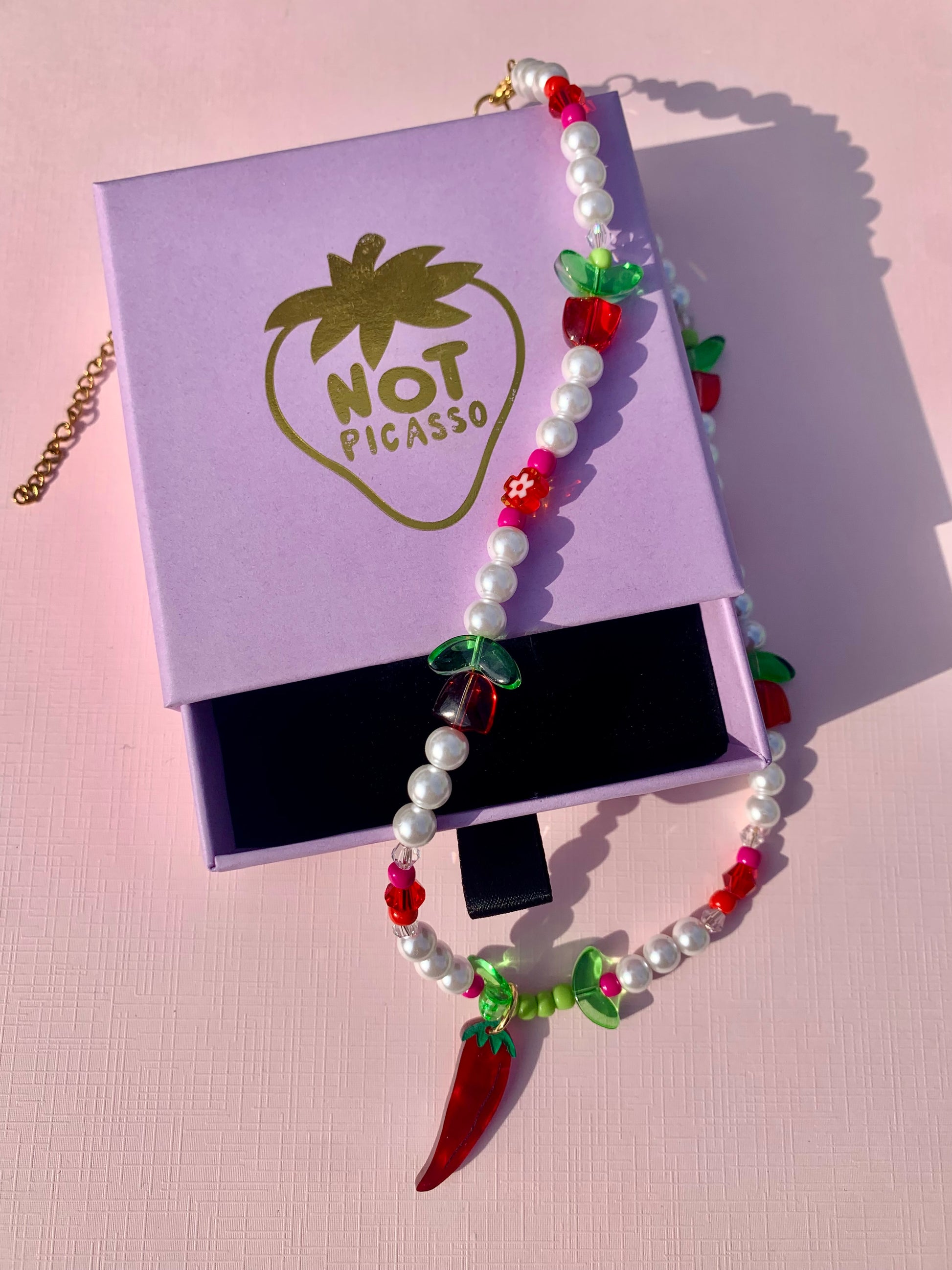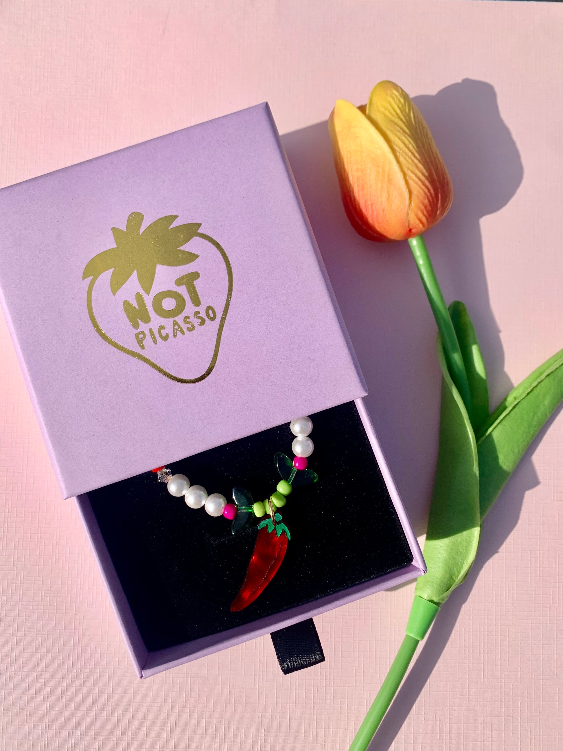 Our beaded necklaces feature an original design and a handmade acrylic charm produced in our home studio. Our necklaces are made using 18k gold plated stainless steel hardware and a combination of faux pearls, glass, and plastic beads. Measuring 16 inches long with a 5 inch extender, our necklaces fit a wide range of people and can be worn at your preferred length.