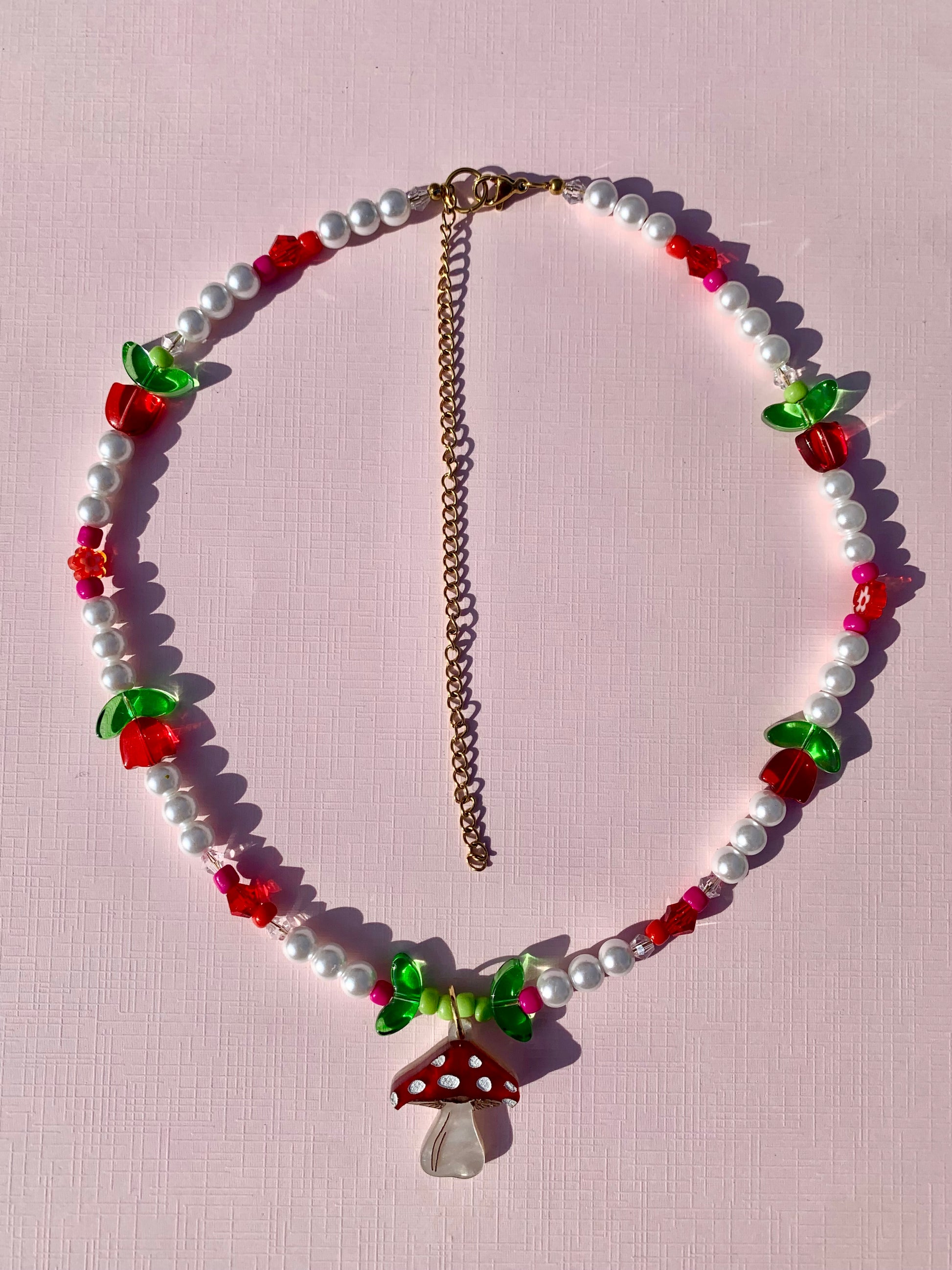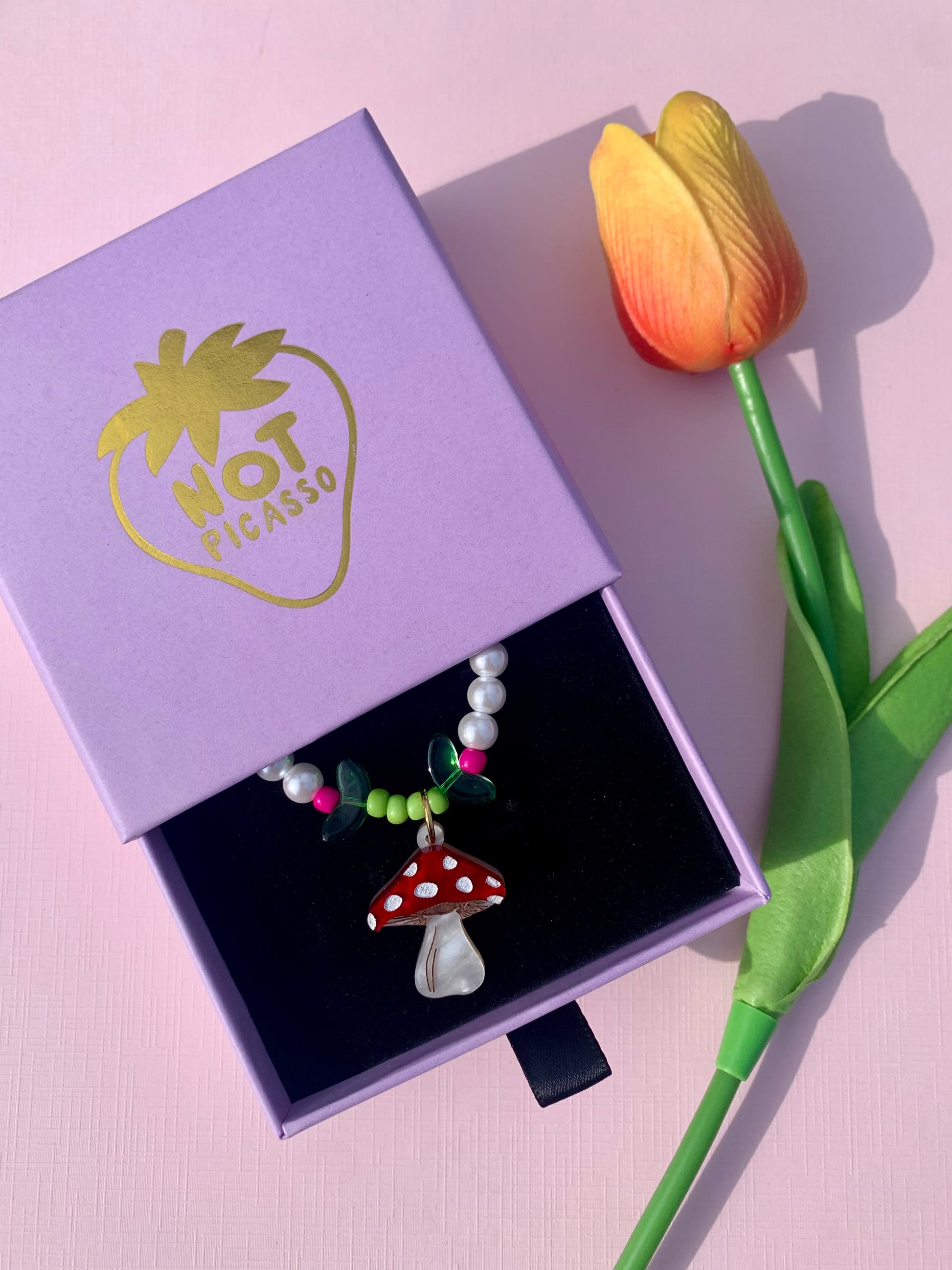 Our beaded necklaces feature an original design and a handmade acrylic charm produced in our home studio. Our necklaces are made using 18k gold plated stainless steel hardware and a combination of faux pearls, glass, and plastic beads. Measuring 16 inches long with a 5 inch extender, our necklaces fit a wide range of people and can be worn at your preferred length.
