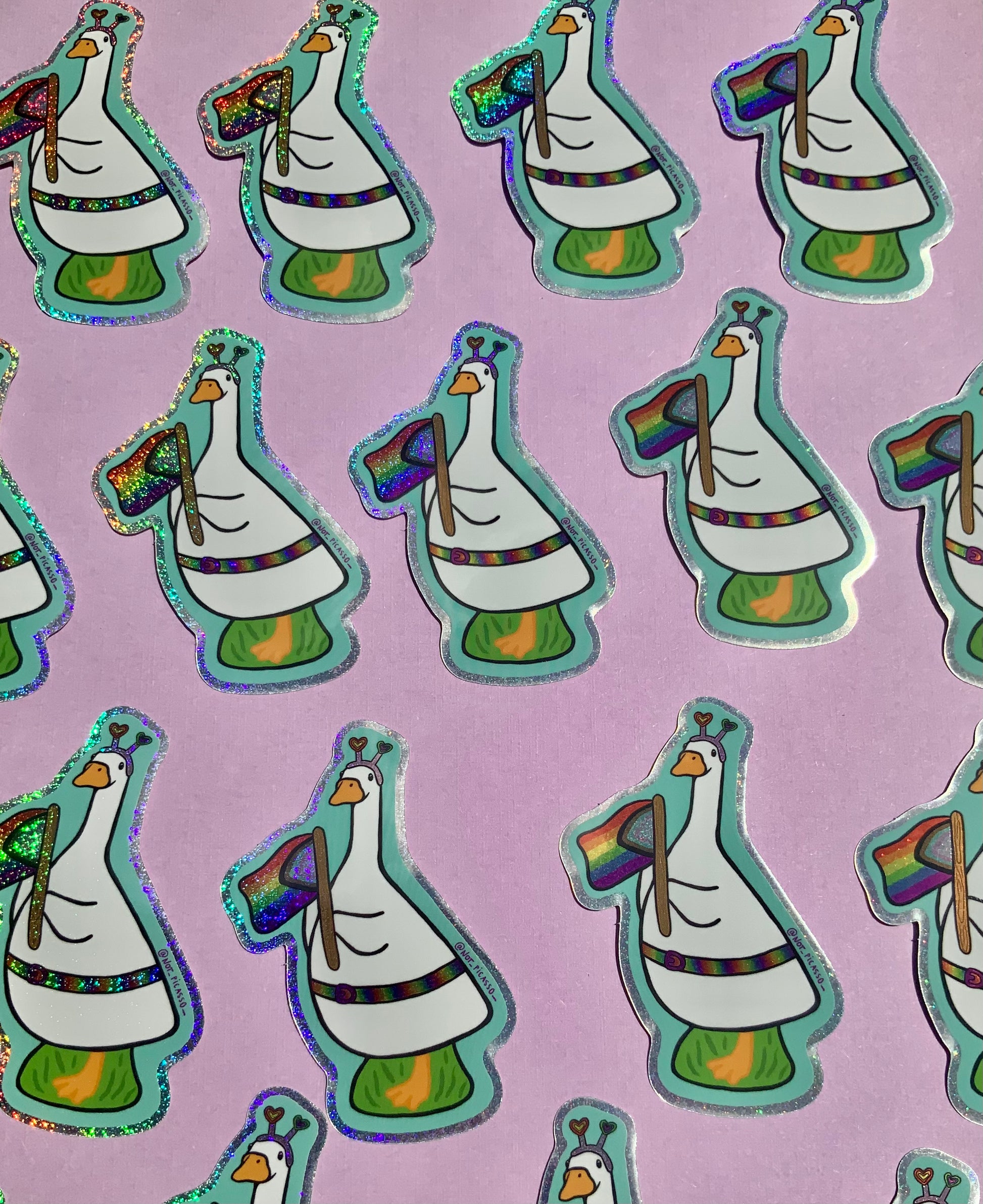 Show your pride with this pride goose sticker. Inspired by the classic Midwestern porch ornament, this goose is proudly showing support for the lgbtq+ community with a pride flag.
